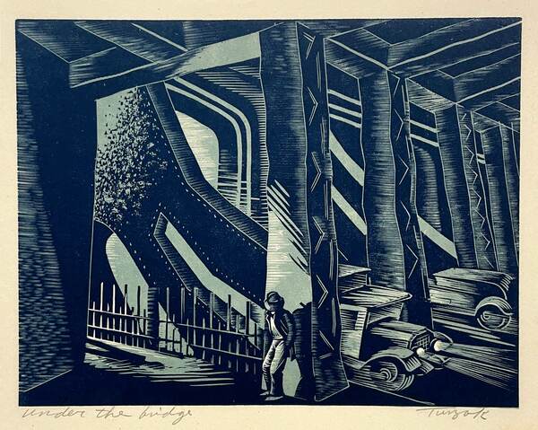 Charles Turzak exhibited at the Art Institute if Chicago in 1940, and also created a WPA post office mural in Lemont, IL. His works can be found in the collections of such museums of the Art Institute of Chicago, the Terra Foundation of American Art, the Smithsonian, Washington, D.C, among others. Later in life, Turzak retired to the Orlando Florida area, where he continued to create prints and paint until his death in 1986.