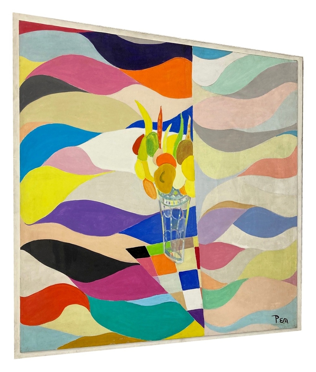 Rudolph Pen understood on an instinctive and molecular level that all things move. His work explores the way in which things move within unusual (often trapezoidal) shapes. Pen believed that our eyes rarely look at anything steadily and directly. His work leads the viewer beyond the confinement of the "square." Most importantly, Pen felt that innovation is the key to art. He is documented as the first artist to advocate shaped canvases.