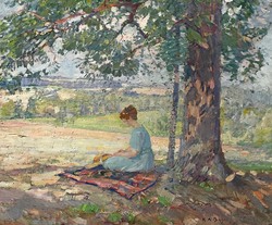 Karl Albert BuehrAmerican, 1866 - 1952Woman Sitting Under a Tree, ca. 1918Oil on canvas, in original frame20 x 24 1/4 inches