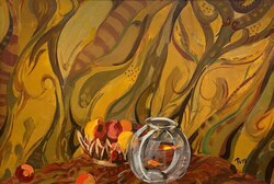 Rudolph T. PenAmerican, 1918 - 1989Untitled (Still Life with Fruit and Gold Fish Bowl), ca. 1960sOil on Masonite24 x 36 inches