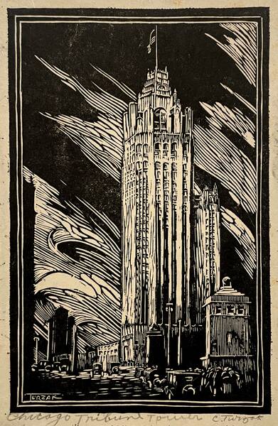 Charles Turzak was one of Chicago’s greatest printmakers of the Art Deco-era. Son of a coal miner, Charles Turzak was born in Streeter, IL in 1899. In 1920, Turzak won the first prize a cartoon contest sponsored by the Purina company and he used his prize money to enroll in the Art Institute of Chicago. Best known as a print maker, in the 1920s & 30s, he created woodcuts of many of Chicago’s most notable buildings, including the Merchandise Mart, Palmolive Building and the Old Water Tower, among others. In 1933, he was commissioned to create woodcuts of many of Chicago’s most iconic buildings to illustrate a guidebook called “All About Chicago” by John and Ruth Ashenhurst” that featured the upcoming Century of Progress Exhibition in Chicago. During the 1933 World’s Fair, Turzak sold a book and collection of prints he created about Abraham Lincoln. Later, he created other series of prints dedicated to other patriots, such as Benjamin Franklin and Alexander Hamilton. Some of these prints also illustrated Federal Hardware and Implement Mutuals Company of Dallas calendars.
