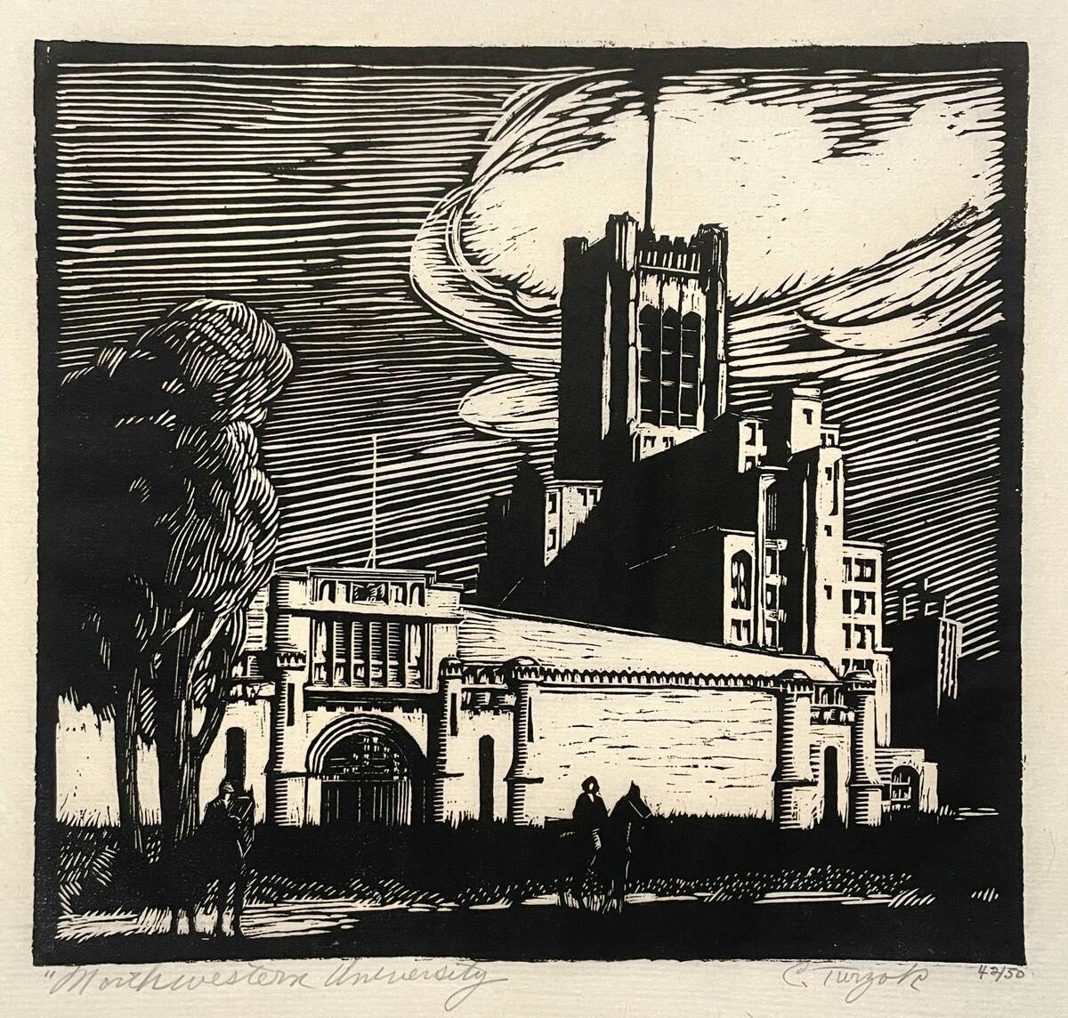 Charles Turzak was one of Chicago’s greatest printmakers of the Art Deco-era. Son of a coal miner, Charles Turzak was born in Streeter, IL in 1899. In 1920, Turzak won the first prize a cartoon contest sponsored by the Purina company and he used his prize money to enroll in the Art Institute of Chicago. Best known as a print maker, in the 1920s & 30s, he created woodcuts of many of Chicago’s most notable buildings, including the Merchandise Mart, Palmolive Building and the Old Water Tower, among others. In 1933, he was commissioned to create woodcuts of many of Chicago’s most iconic buildings to illustrate a guidebook called “All About Chicago” by John and Ruth Ashenhurst” that featured the upcoming Century of Progress Exhibition in Chicago. During the 1933 World’s Fair, Turzak sold a book and collection of prints he created about Abraham Lincoln. Later, he created other series of prints dedicated to other patriots, such as Benjamin Franklin and Alexander Hamilton. Some of these prints also illustrated Federal Hardware and Implement Mutuals Company of Dallas calendars.