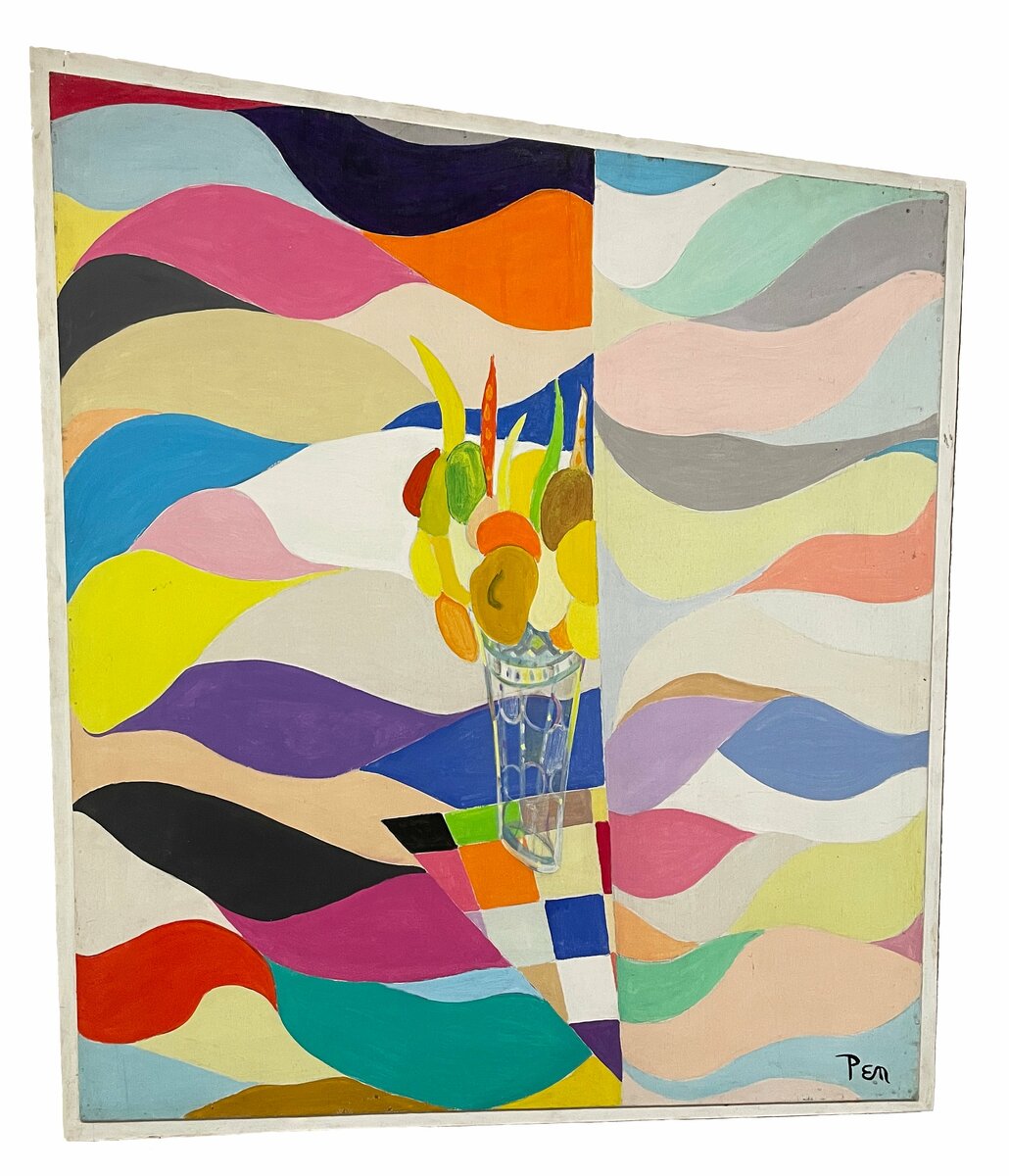 Rudolph Pen understood on an instinctive and molecular level that all things move. His work explores the way in which things move within unusual (often trapezoidal) shapes. Pen believed that our eyes rarely look at anything steadily and directly. His work leads the viewer beyond the confinement of the "square." Most importantly, Pen felt that innovation is the key to art. He is documented as the first artist to advocate shaped canvases.
